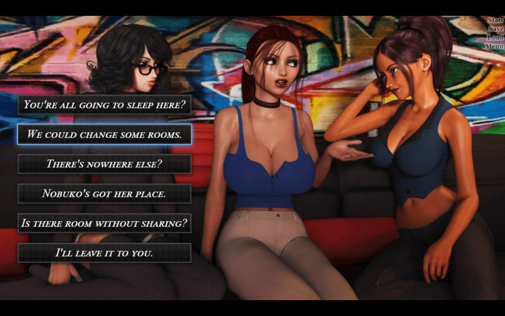 I’ve illustrated it that way because there really is what feels like a gamut of scenes, contingent on juggling your relationships states across the girls. You’ll have runs where you’ll work on two of ’em and see where it goes and what unlocks. Then you’ll have runs where you’ll focus on pimping out a specific girl or two to unlock that line of content. Even after 7+ playthroughs, I haven’t quite seen everything PAT has to offer. Fear not, though, as the game does take some strides to make this easier for the player, but I’ll get into that later.