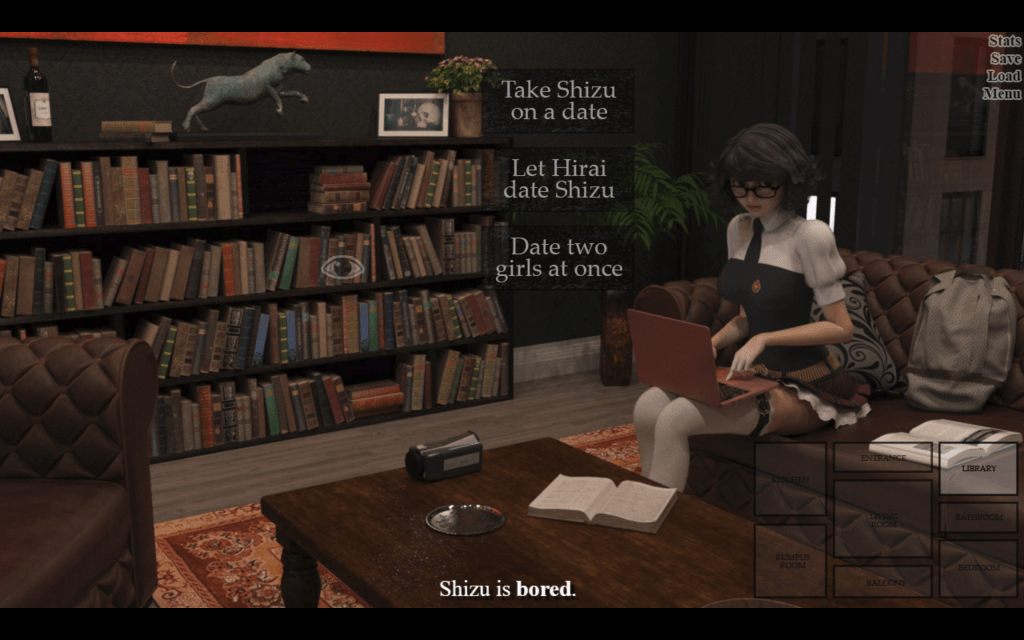 - You have a voyeuristic school girl who films everything – sometimes even unbeknownst to you. I particularly like how this becomes a game mechanic, as you can ask to playback scenes and watch them with her. This creates an interesting design space where you can view old content in a new light, while adding a sexy scene on top a sexy scene.